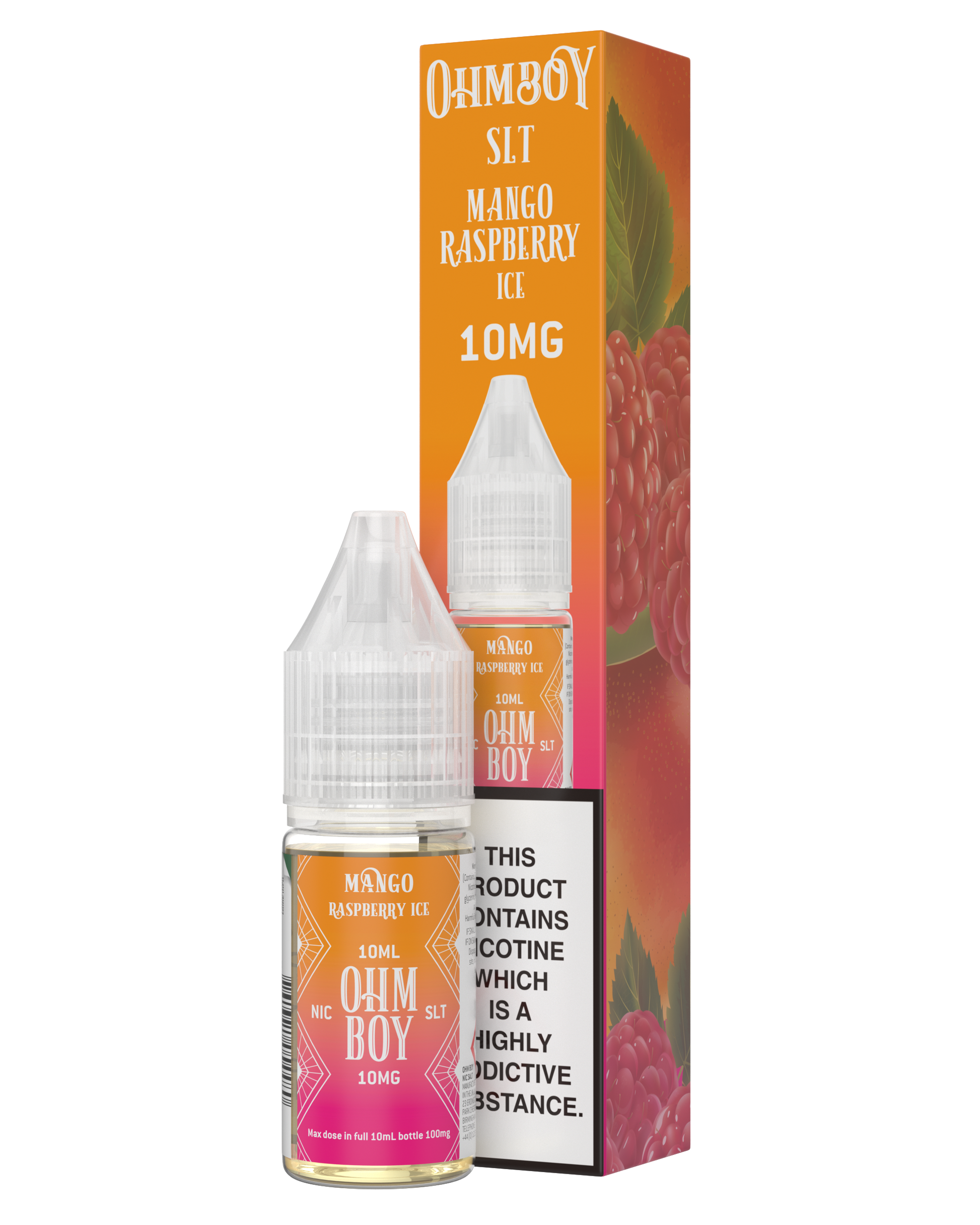 Ohm Boy SLT Mango Raspberry Ice 10ml salt nicotine e-liquid. Extra concentrated with maximum taste. Tropical mango meets sweet raspberry with a refreshing ice finish. Premium UK e-liquid with smooth throat hit. Available in multiple nicotine strengths (5mg, 10mg, 20mg). Part of our 3 for £10 offer on 10ml e-liquids.